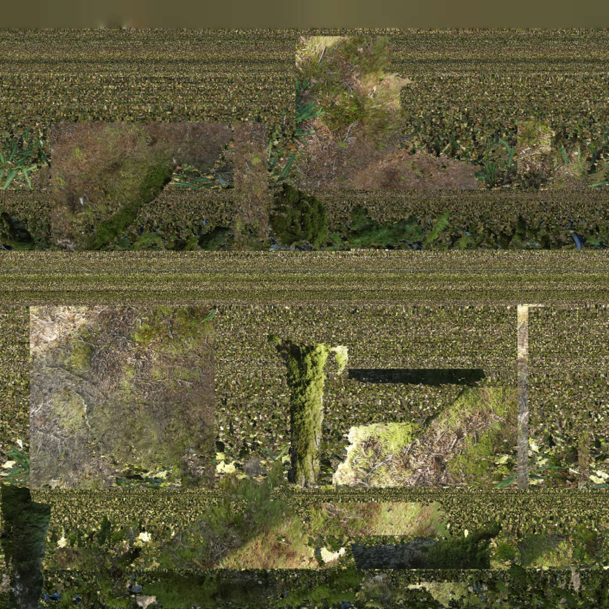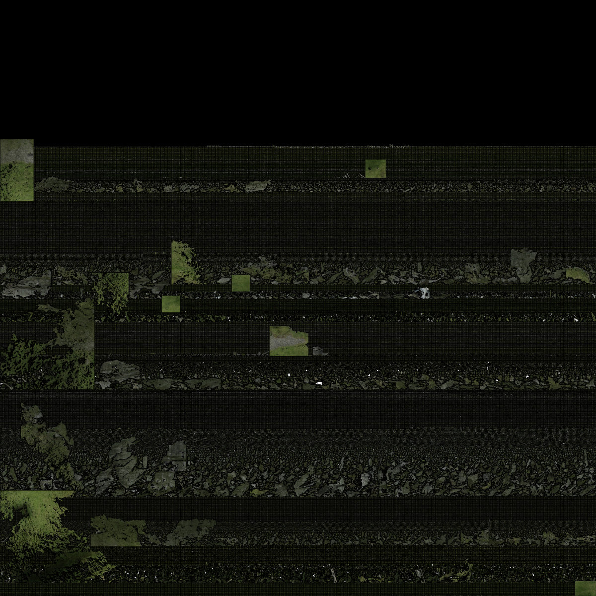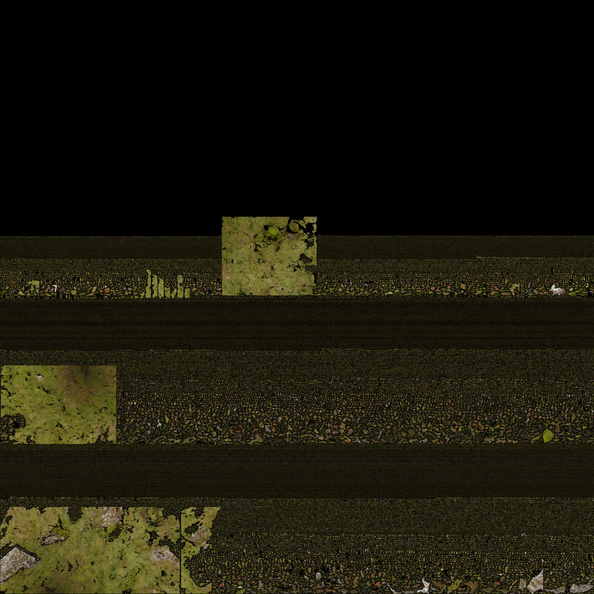 To create a photorealistic look and feel for a 3D model you can make a photo texture. This is the last step of the 3D reconstruction process in the Photogrammetry software. To be able to do this, the software unfolds the 3D model into a 2D shape. Think of it as a cardboard box that you unfold in a way that it becomes a 2D shape out of one piece. The software uses this fold-out to take parts of the original photos that were used to reconstruct the 3D model and stitch it in a way that if you fold it back to the 3D model, you have a 3D version of the photo. This 2D photo file is used as texture to wrap around the the meshed 3D model. This finally gives the photo realistic look and feel of the 3D model. These generated photo textures are sometimes little artworks by themselves. Like abstract generative paintings. On the left you find a serie of these photo textures.